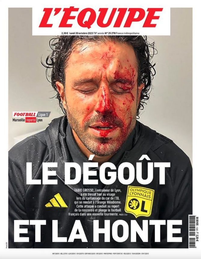 Fabio Grosso, suo malgrado, alcuni anni fa è stato protagonista di una triste pagina che con il calcio ha ben poco a che vedere. L'attuale tecnico del Sassuolo, ha guidato il Lione per un paio di mesi, e ha rischiato di perdere un occhio dopo l'assalto dei tifosi del Marsiglia al pullman dell'OL. Il tecnico, gravemente ferito dalle schegge dei vetri in frantumi, è finito col volto insanguinato sulla prima pagina de L'Equipe su una prima pagina che, nonostante tutto, è storia.