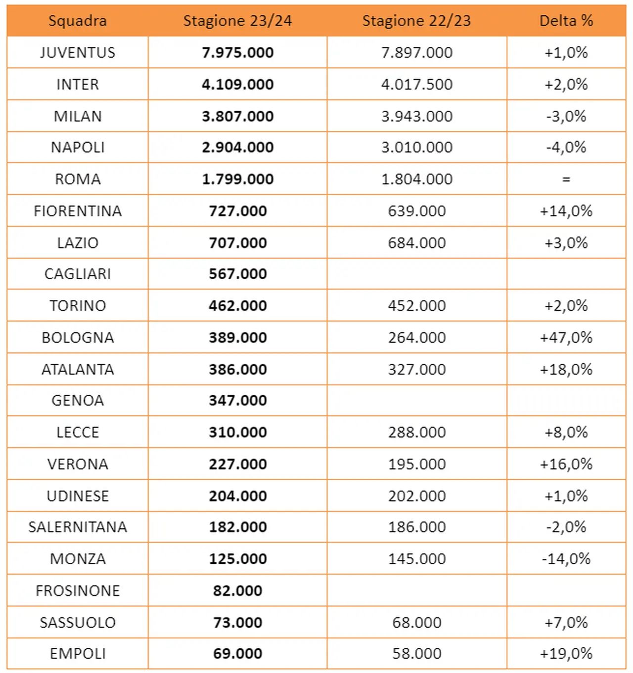 Al termine della stagione 2023/2024, il numero totale dei tifosi delle squadre di Serie A ha raggiunto quota 25.451.000, con un incremento del 3,9% rispetto alla stagione precedente, quando si attestarono a 24.480.000. Questo aumento è attribuibile principalmente alla forte crescita dei 15 club che non appartengono ai cinque maggiori della classifica, ovvero Juventus, Milan, Inter, Roma e Napoli.