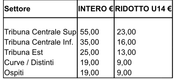 Le modalità di vendita dei biglietti del settore Ospiti (Distinti Sud Est – Porta 7) saranno rese note entro lunedì 13 ottobre p.v sulla base delle indicazioni fornite dall’Autorità di P.S.