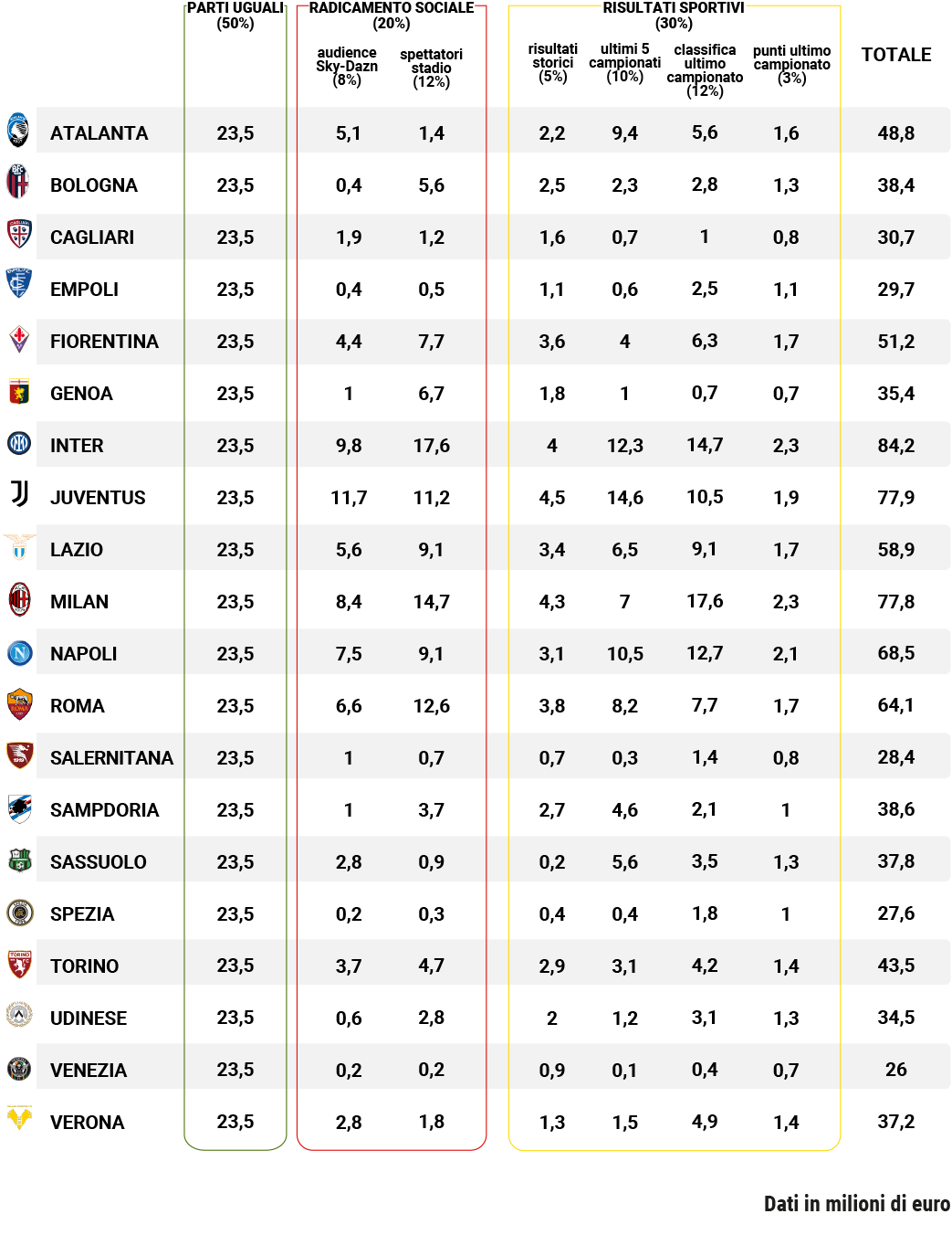 Ricordiamo che la ripartizione dei proventi da diritti tv prevede una distribuzione delle risorse provenienti dalla commercializzazione delle partite come segue: