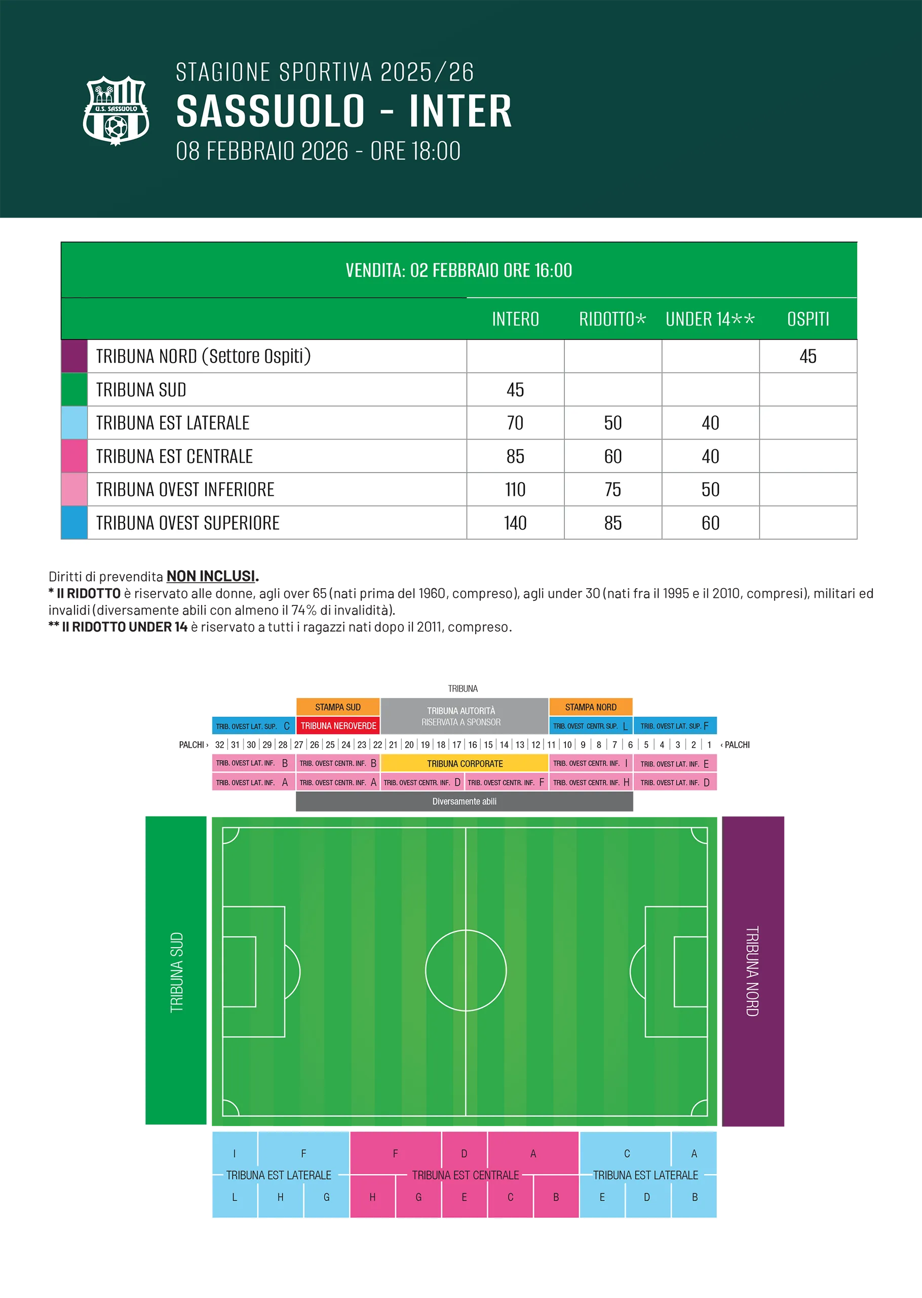 Si ricorda che l’acquisto di biglietti in Tribuna Sud è esclusivamente riservato ai possessori di Sassuolo Card (sottoscritte entro il 30 giugno 2025).