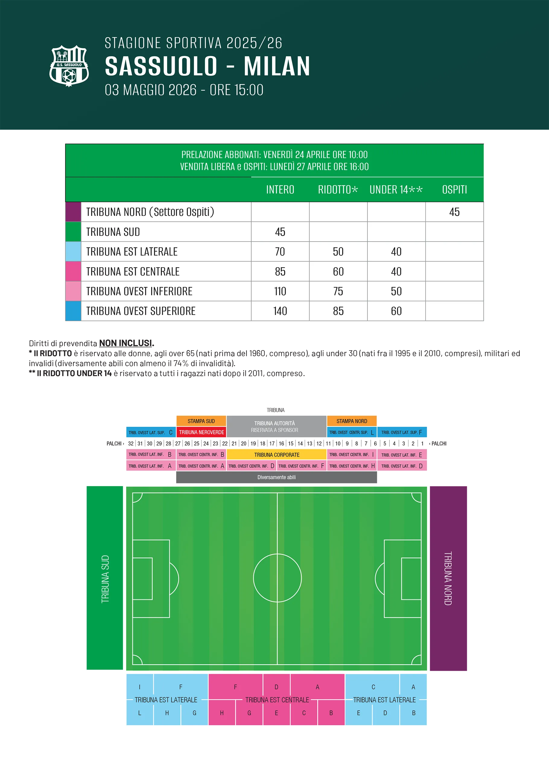 dalle ore 10 di venerdì 24 fino a domenica 26 aprile sarà attiva una prelazione riservata agli abbonati 2025/26 del Sassuolo Calcio che potranno acquistare fino a 2 biglietti per i propri amici e familiari esclusivamente nel settore del proprio abbonamento;